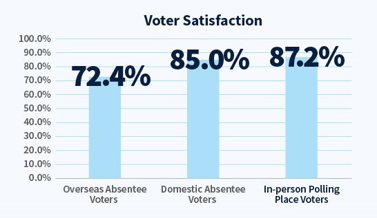Satisfaction with the voting experience has decreased since the 2020 election across all voter groups. While domestic absentee voters reported an 85.0% satisfaction rate and polling-place voters 87.2%, satisfaction among overseas absentee voters lagged behind at 72.4%. These figures indicate a need for further improvements in the overseas voting process.